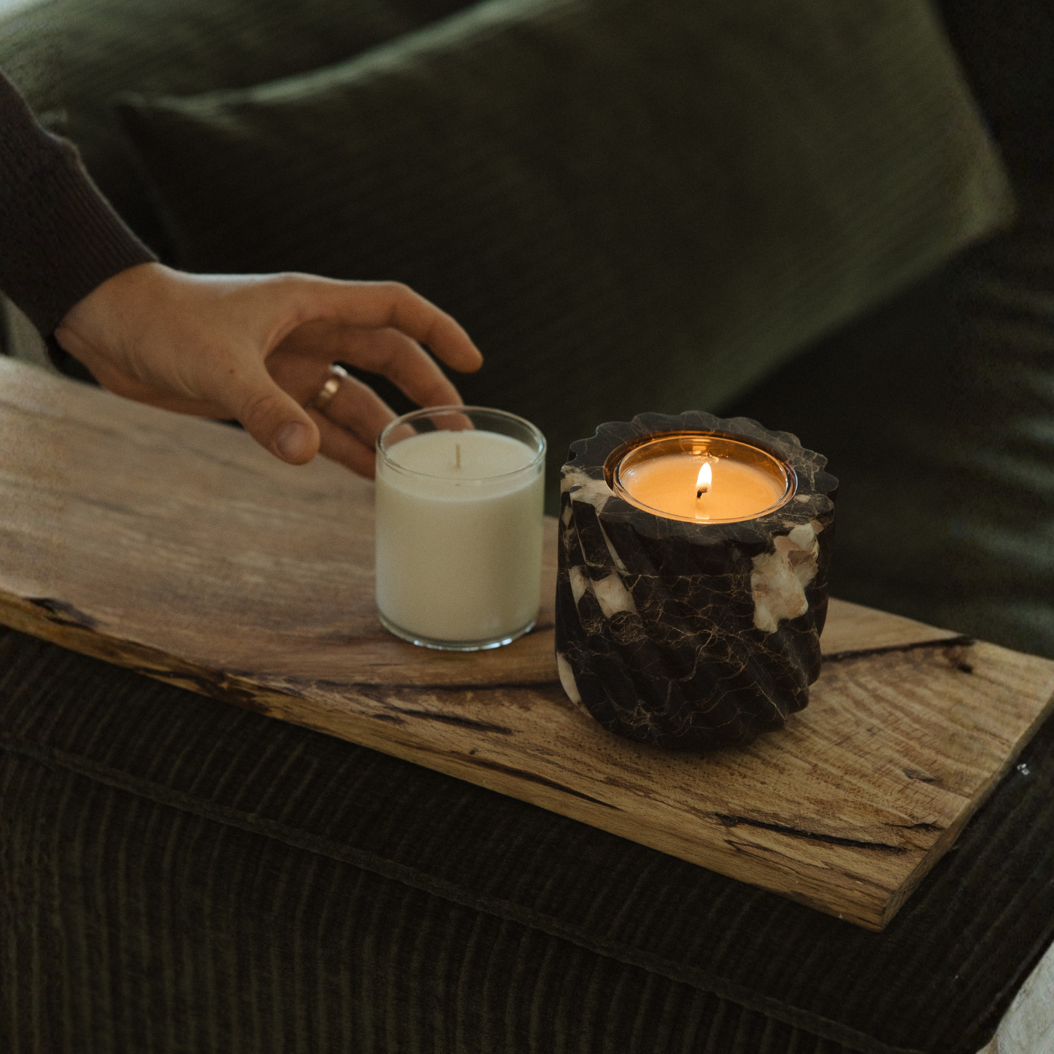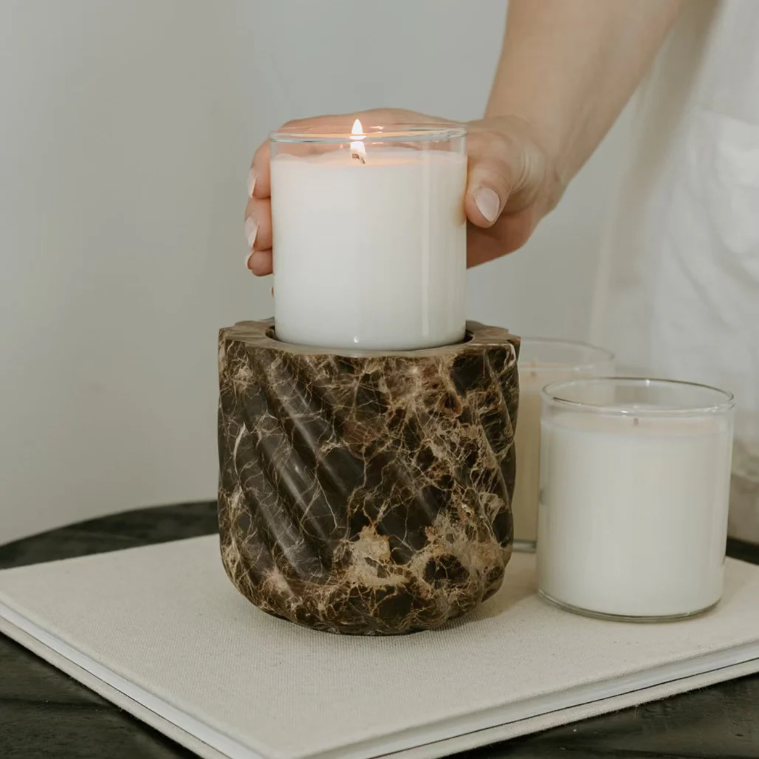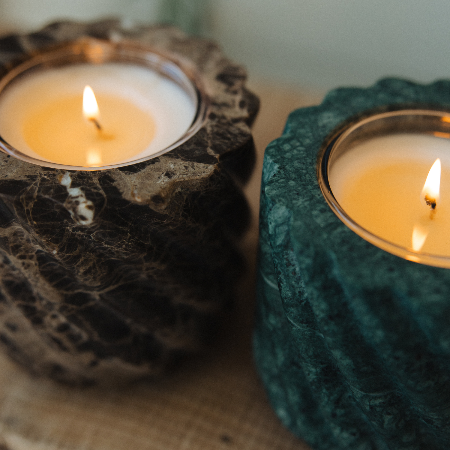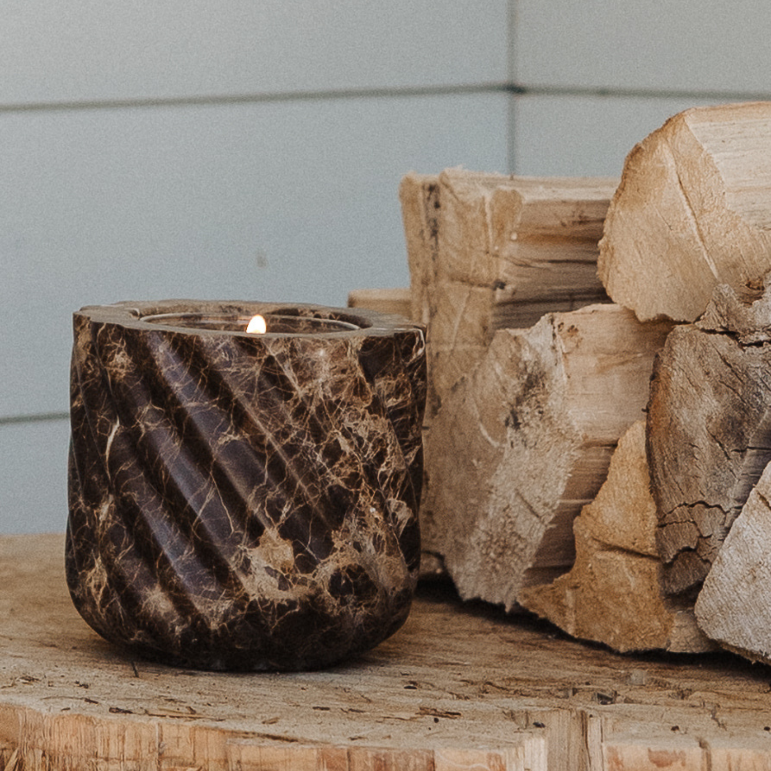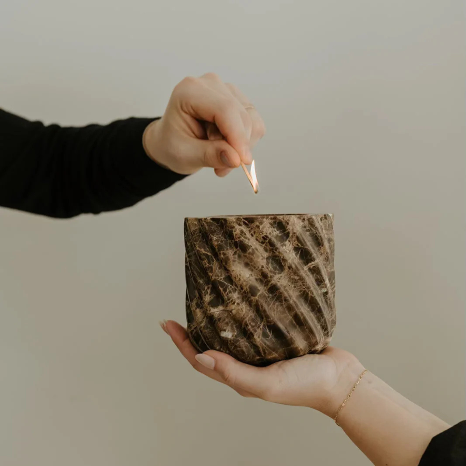 An opulent earth, traced in copper and light. Brown Emperador Marble reveals a rich dark ground, streaked with fine copper veins and glimmers of white crystallization—patterns as intricate as they are timeless. Its roped form accentuates the stone’s natural depth, creating a vessel of quiet strength and enduring beauty. Sourced from Spain and refined by artisan hands, each piece is shaped and polished to a smooth finish yet remains one-of-a-kind in character. A sculptural accent for any setting, it arrives with our unscented No. 00 | Dinnertime candle insert—crafted to glow, to refill, to last.