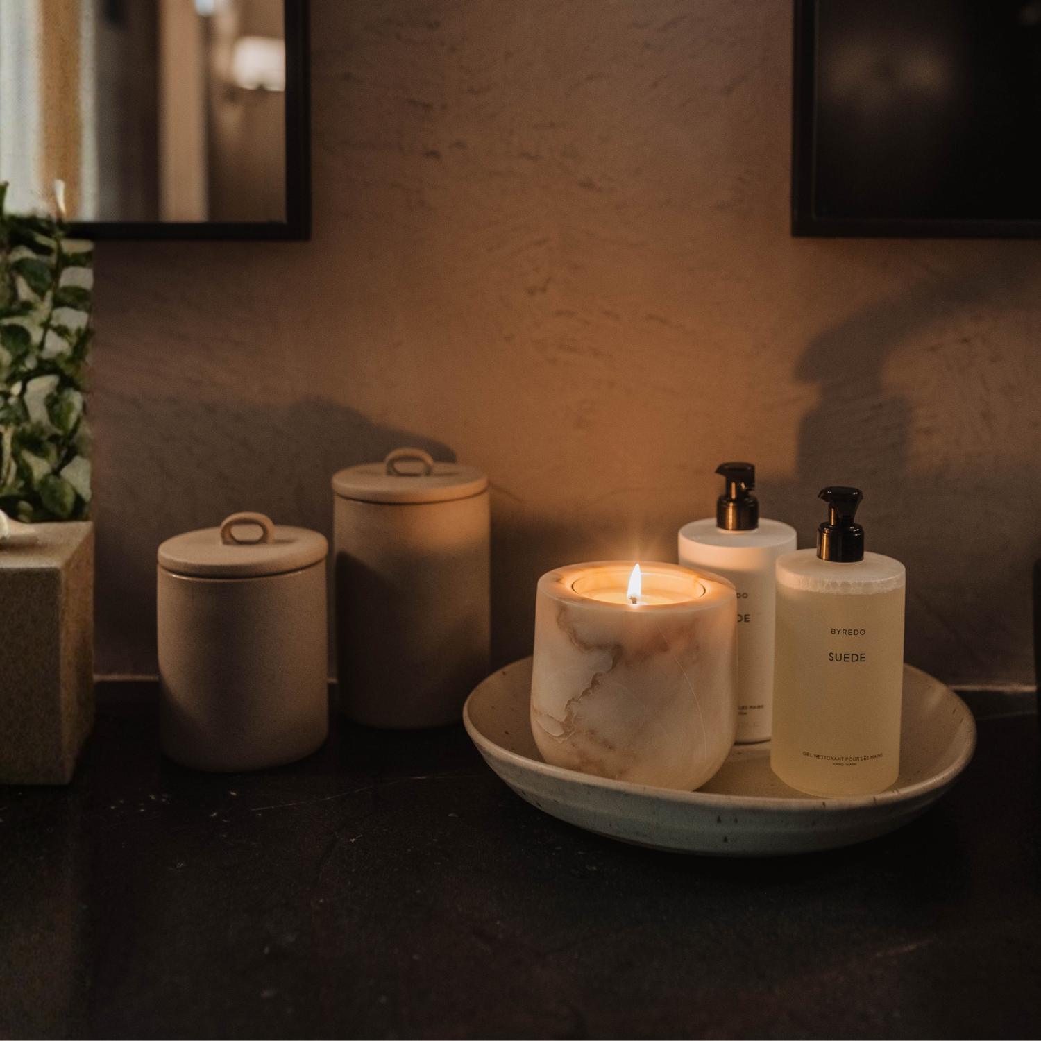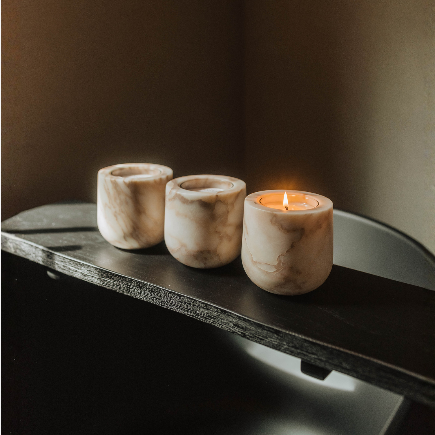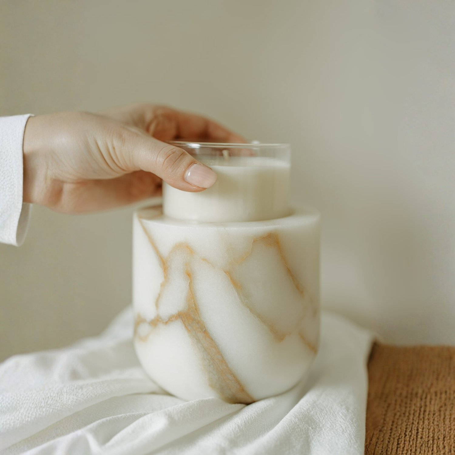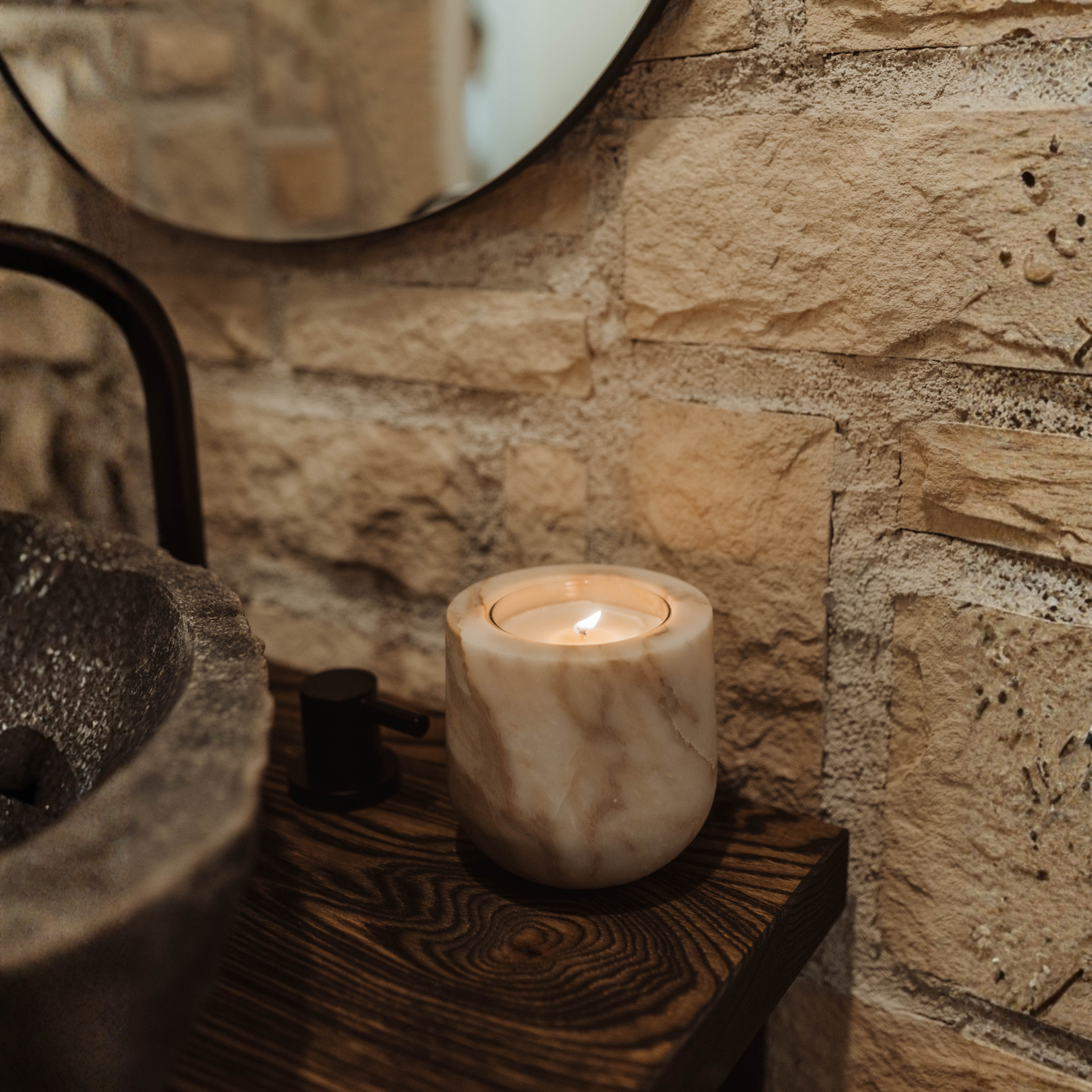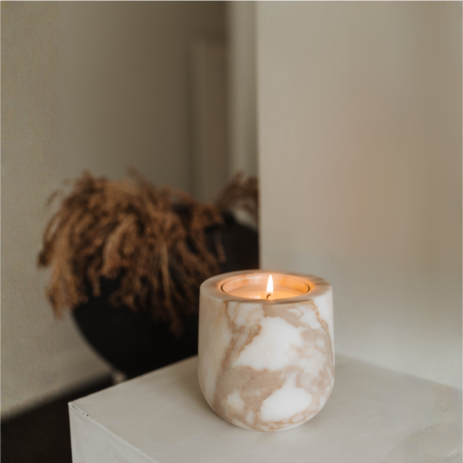 A canvas of stone, veined in gold. Calacatta Gold reveals a luminous white ground traced with fluid ribbons of beige and deep, molten gold—patterns born in the earth, no two ever alike. Sourced from the quarries of Italy, each vessel is hand-finished by artisans, its form polished to a smooth, sculpted elegance. More than a vessel, it is a piece of enduring beauty—crafted to be refilled, lived with, and cherished. Within rests our unscented No. 00 | Dinnertime candle insert, ready to cast its quiet glow.