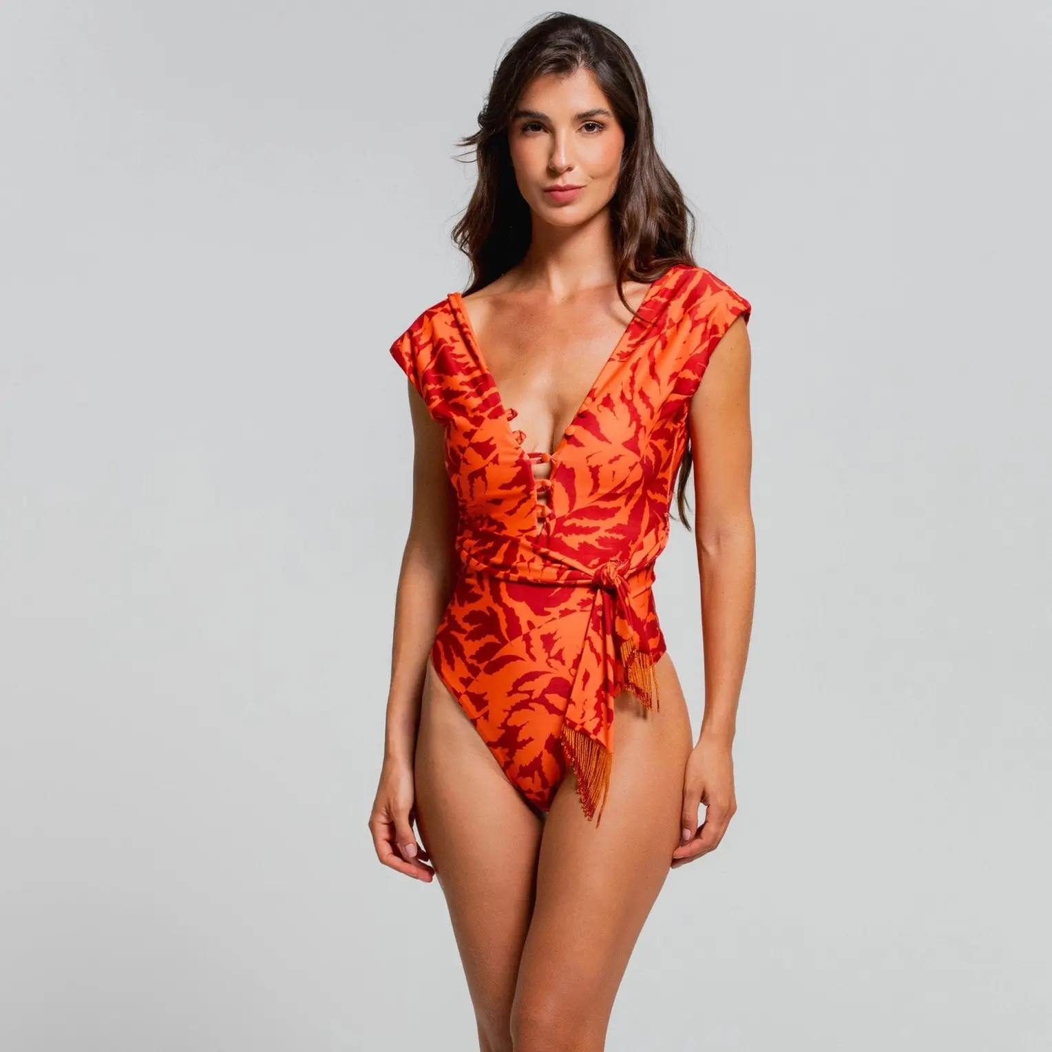 A silhouette defined by confidence and quiet allure. The Leaves of the Sun Plunge One Piece draws the eye with its bold neckline, softened by delicate ties finished with beaded accents that speak to artisanal detail. The form is sculpted yet fluid, offering a balance of structure and ease.