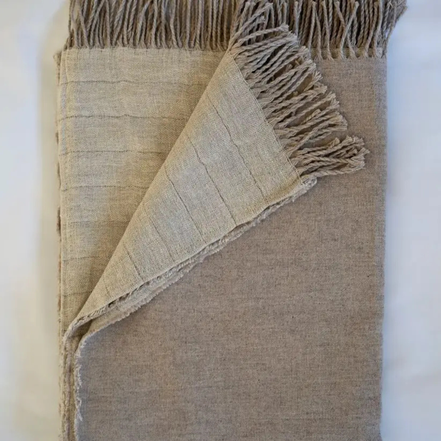 From the forest comes a study in balance—grounded yet graceful. Its weave carries a rustic spirit, simple in form, quietly elegant in earthy tones. One side linen, the other merino lambswool, it holds a substantial weight—never bulky, always poised. A timeless layer, crafted to comfort, to endure, and to root your space in nature’s quiet luxury.