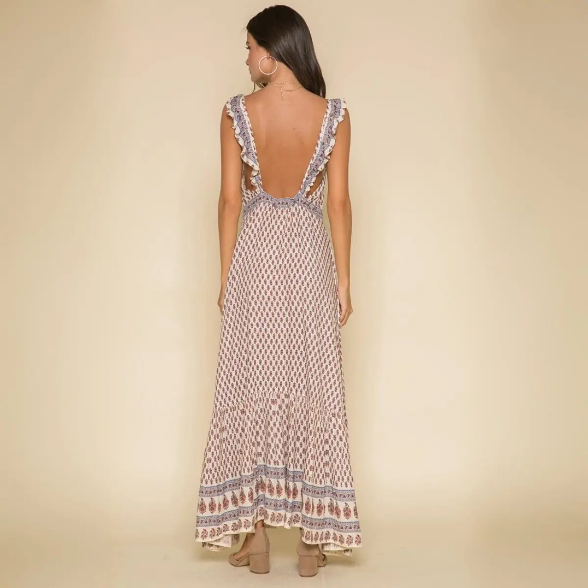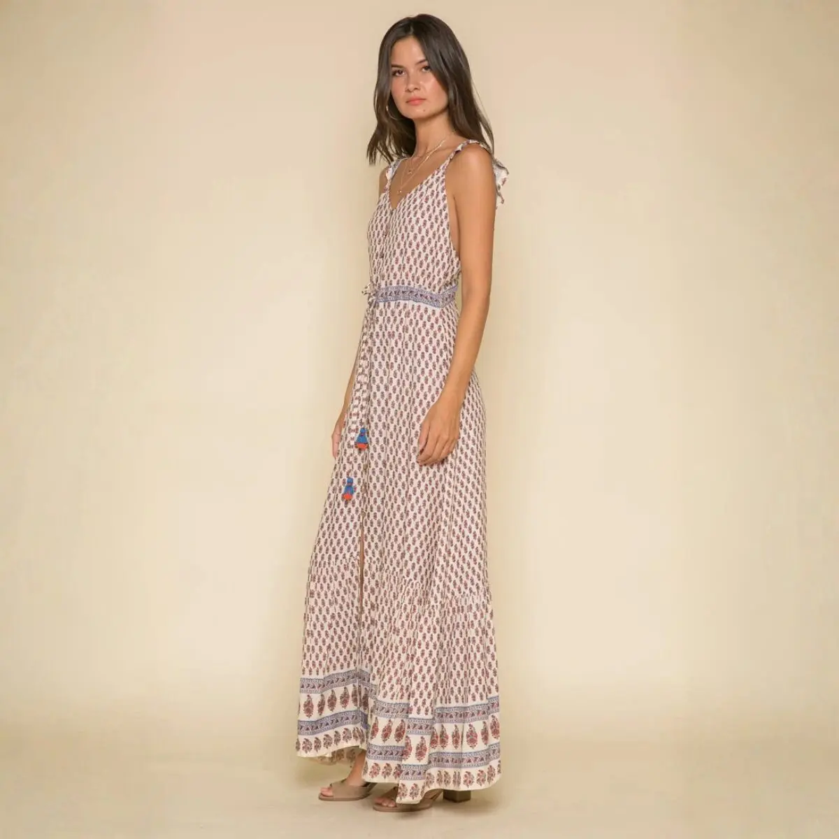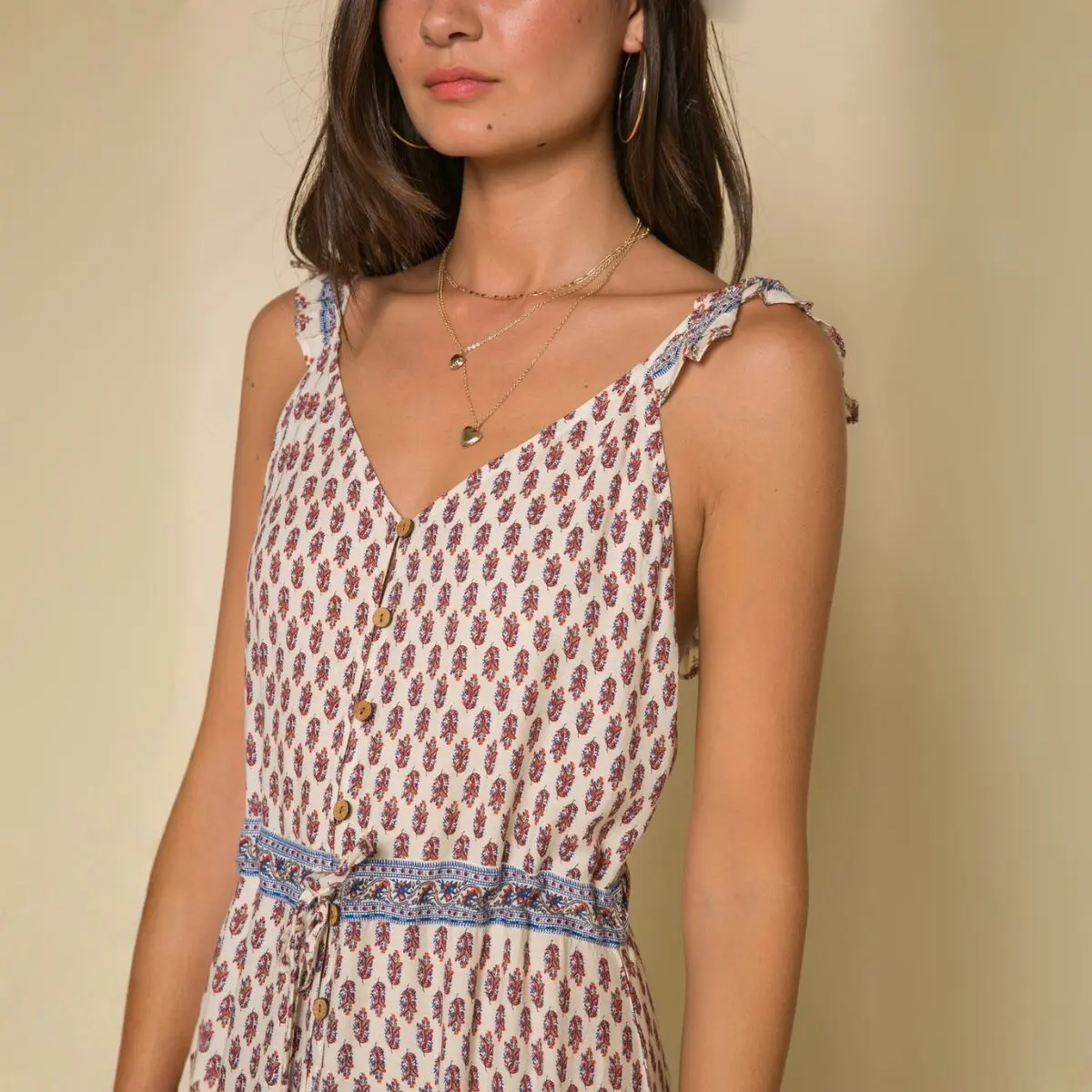 Effortless, with a quiet allure. The Avah reveals a mesmerizing play of color, its fluid silhouette softened by delicate ruffle sleeves and an elegant drape. A line of front buttons lends subtle refinement, while mid waist tassel ties shape the form with ease and intention.