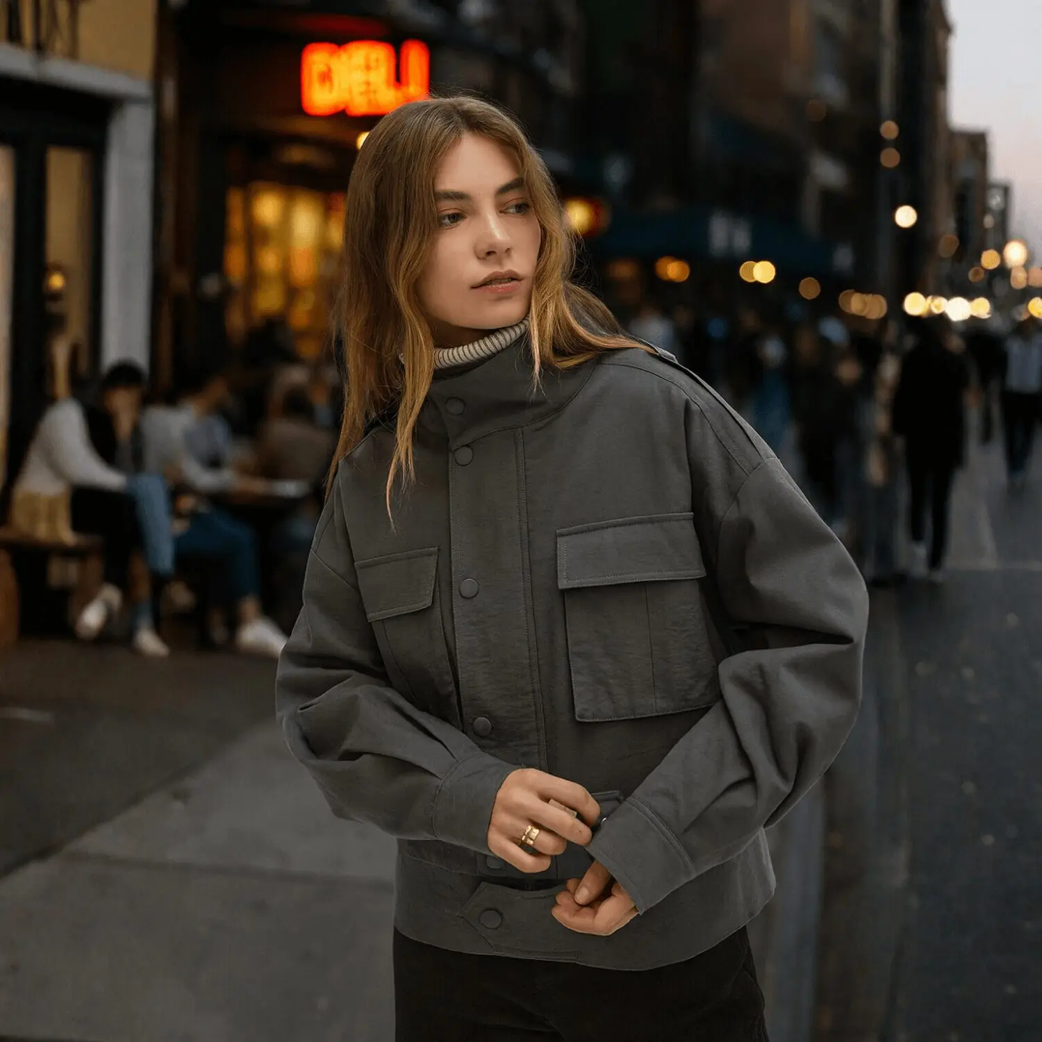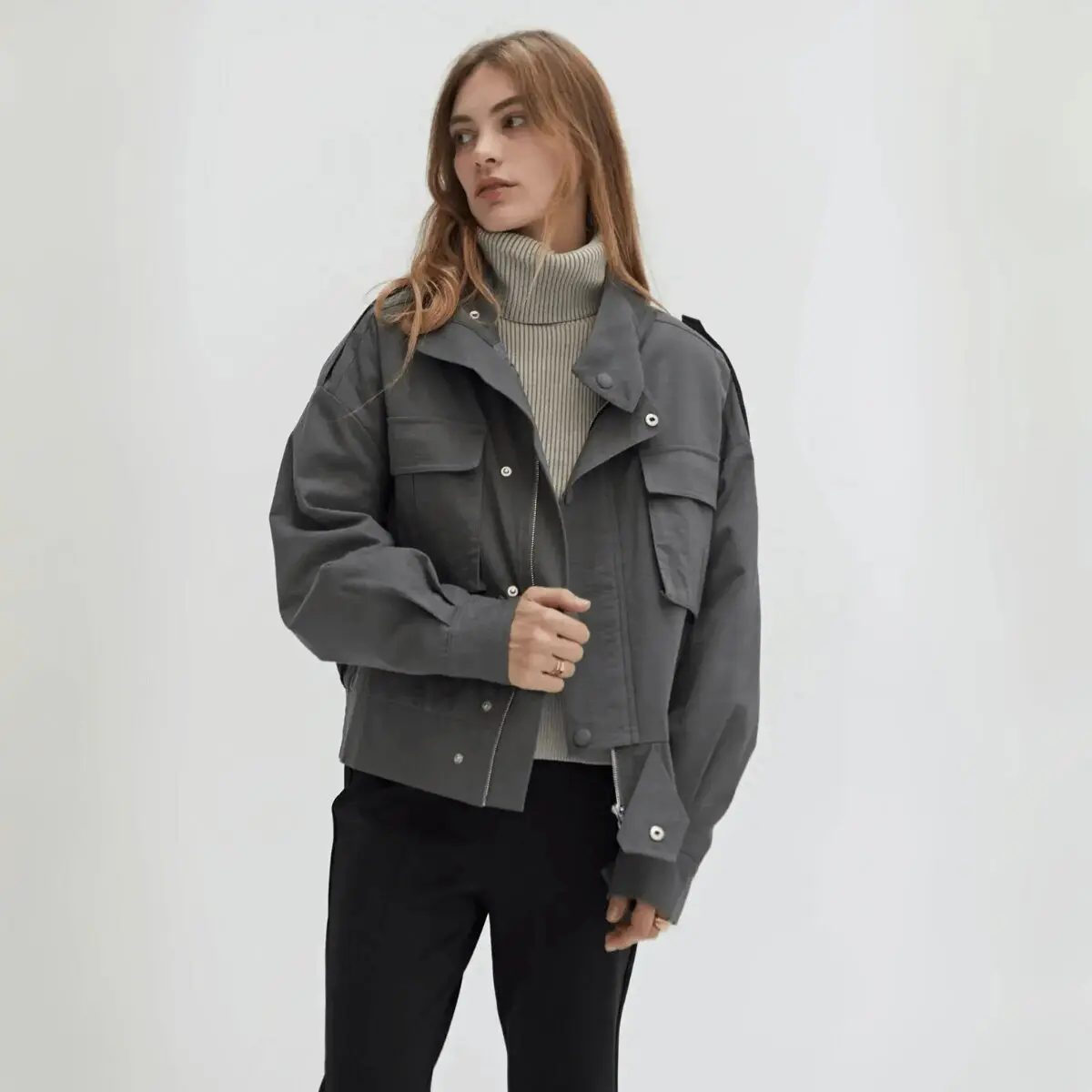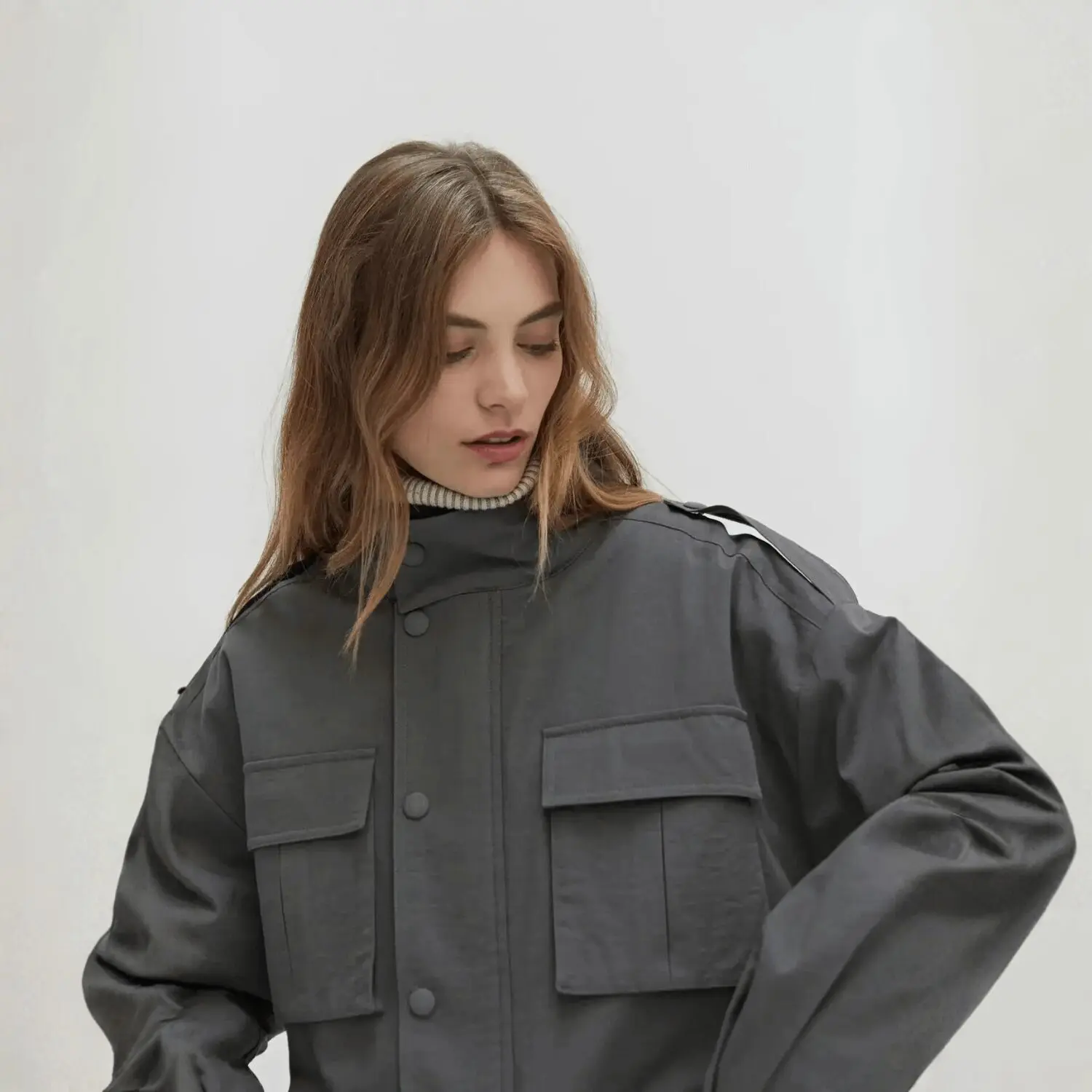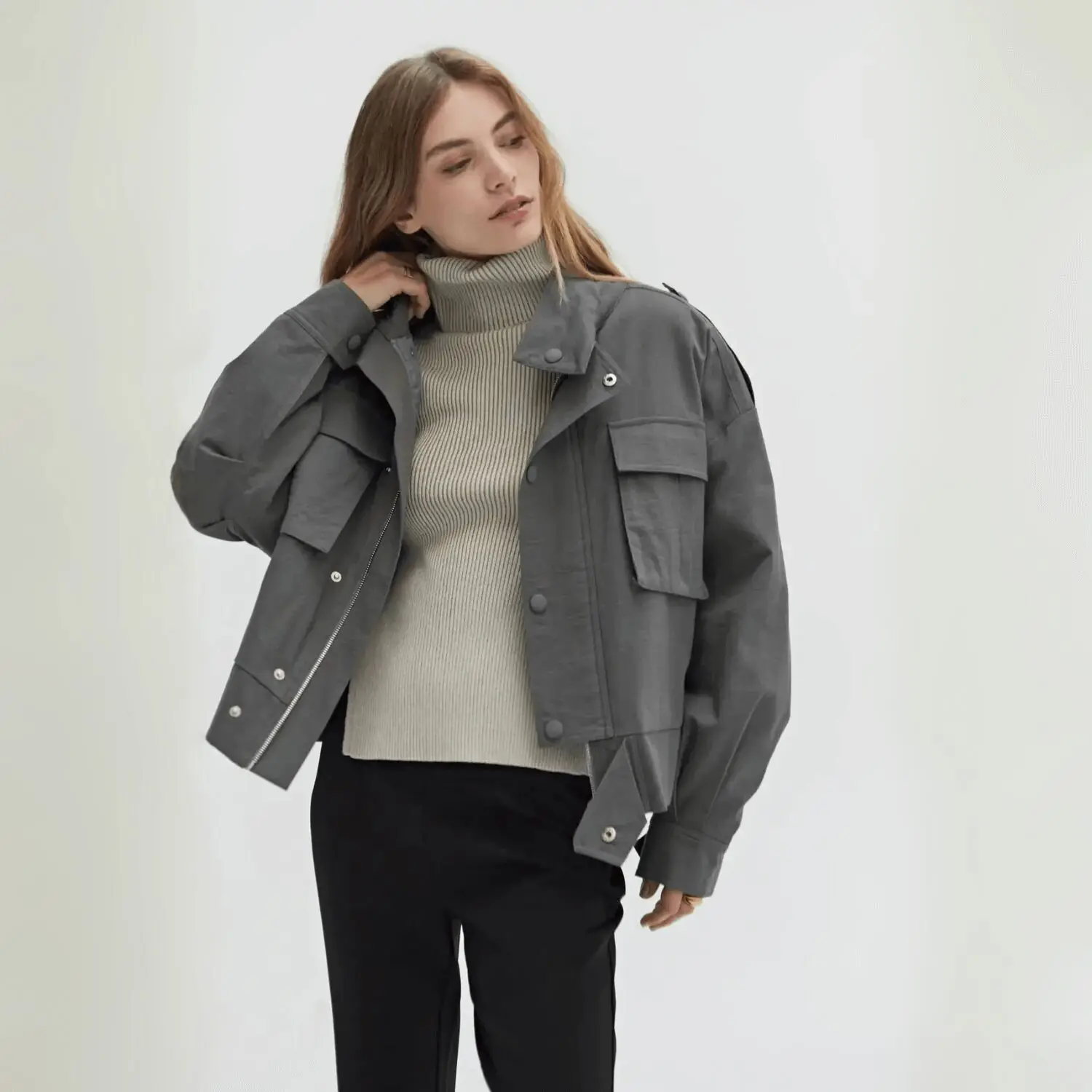 Charcoal like midnight stone—strong, understated, endlessly versatile. A high mock neck rises with quiet confidence, while quilted lining lends a whisper of warmth for shifting seasons. The concealed zip and snap-front closure keep the lines clean, refined, almost secretive.