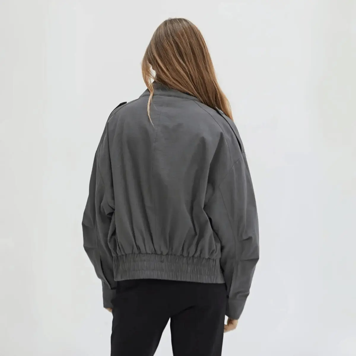 Relaxed shoulders fall effortlessly, cinched at the waist with a subtle gather that shapes without effort. Utility in spirit, elegance in form—this is the kind of piece that moves with you, from city streets to quiet escapes, a rare balance of strength and ease.