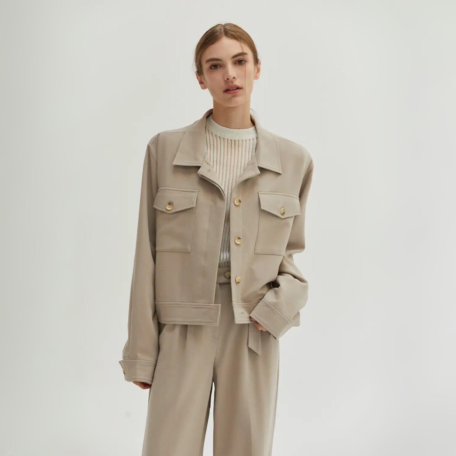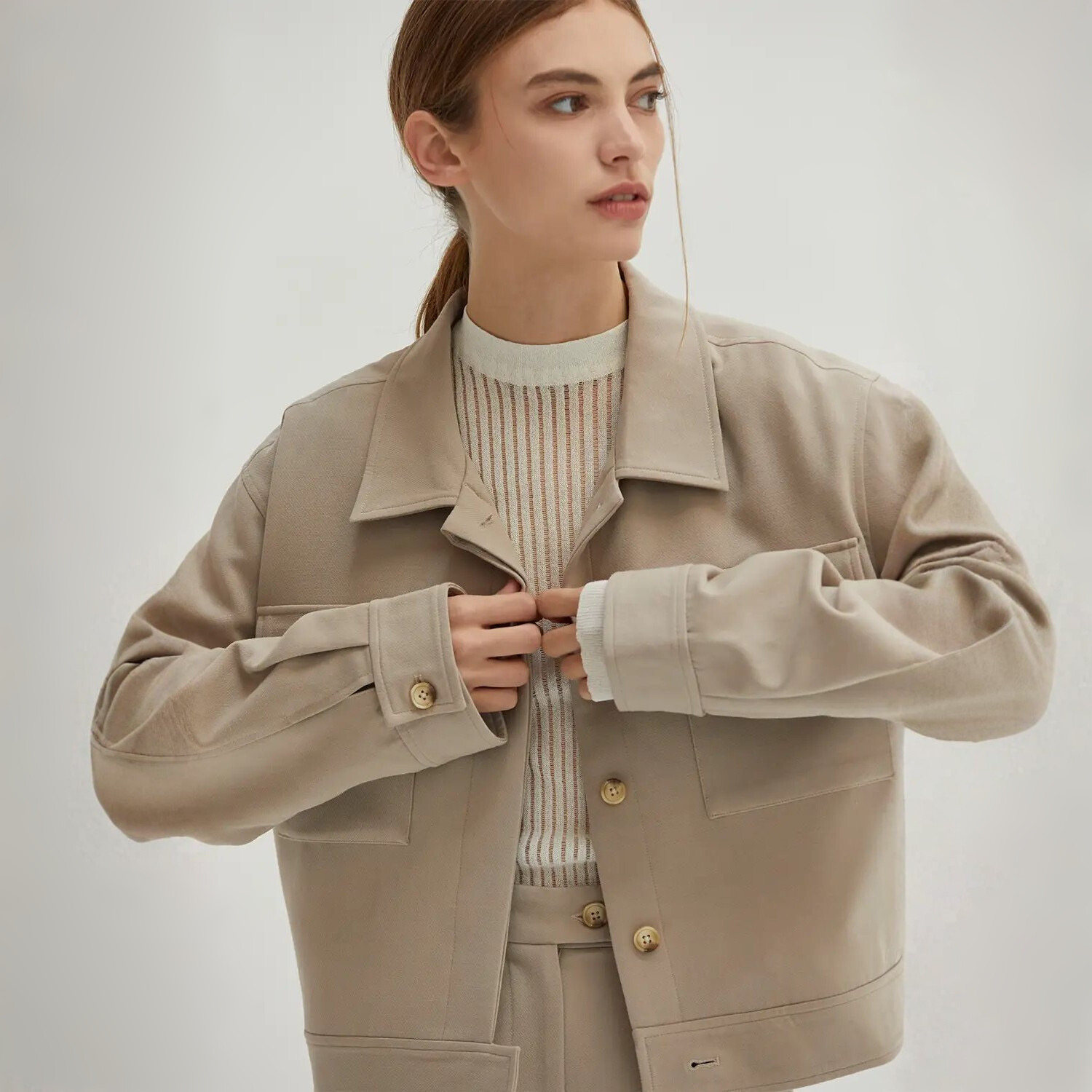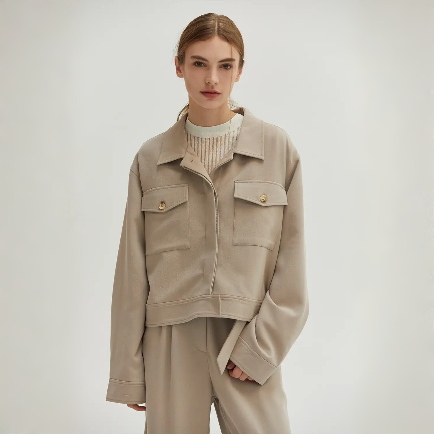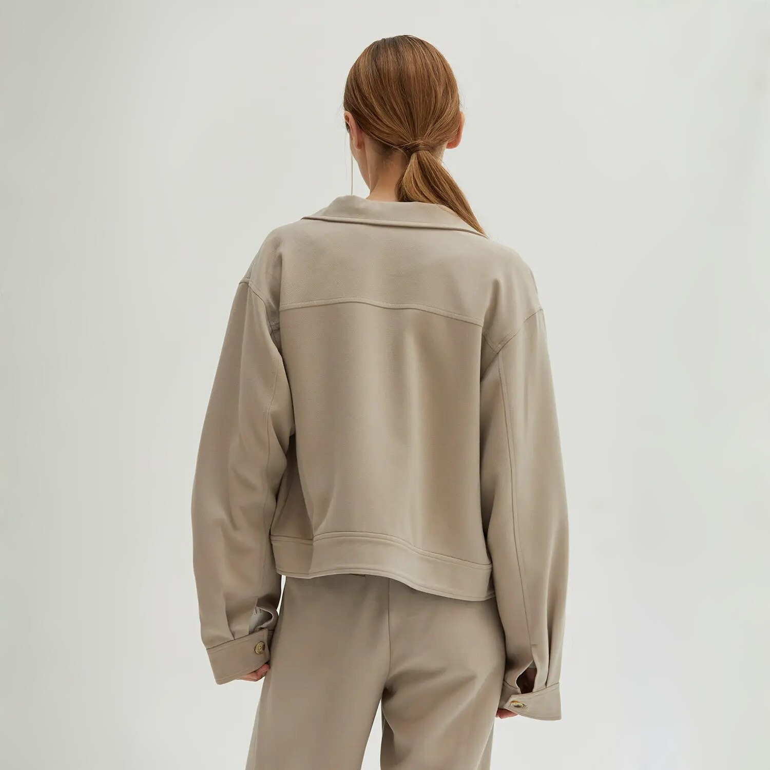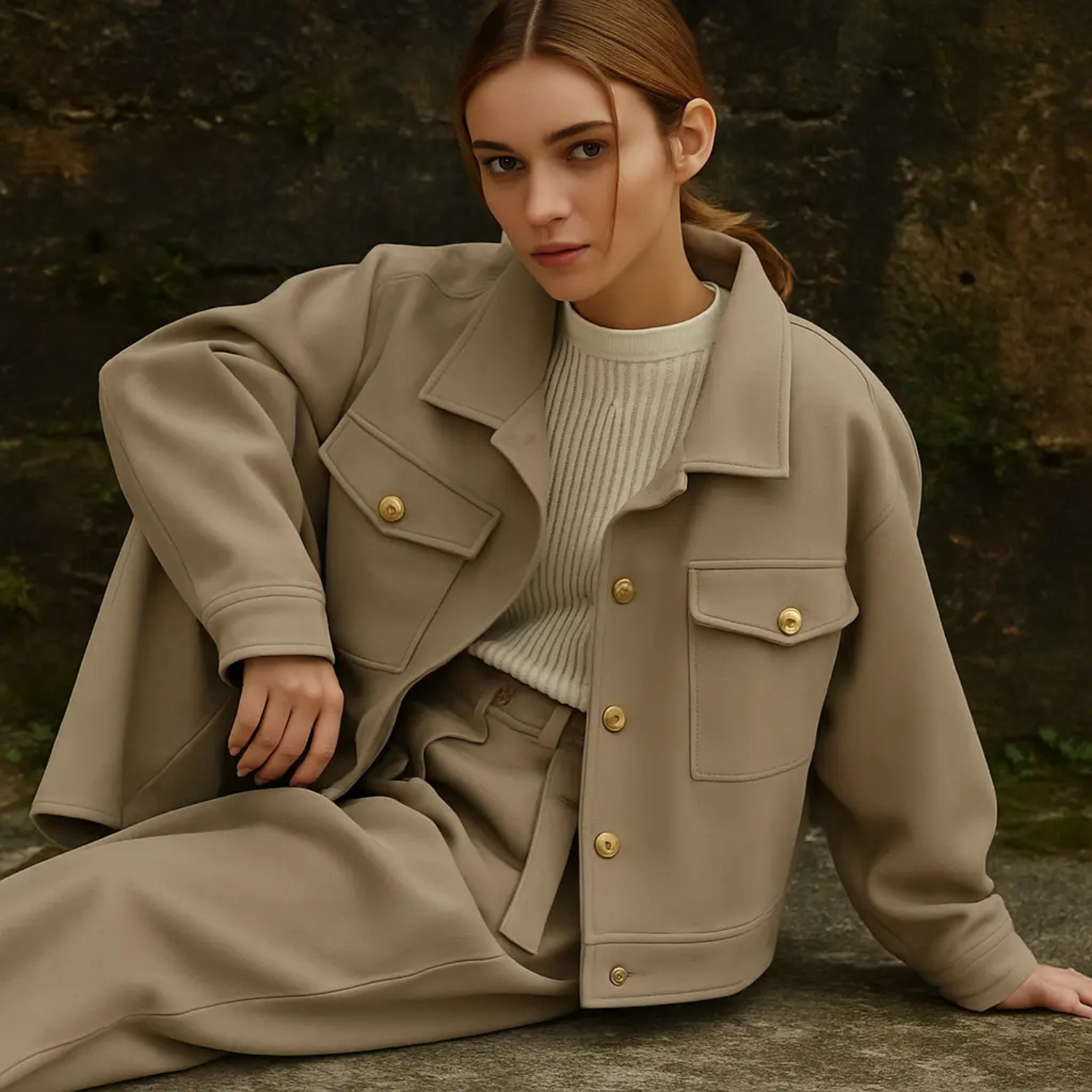 In the quiet strength of stone, elegance emerges. This jacket carries presence without pretense—fully lined, structured yet fluid, refined in every seam. A high collar and buttoned cuffs speak to tailored precision, while oversized pockets ground the silhouette in utility reimagined as luxury. The hidden closure keeps the lines uninterrupted, a whisper of restraint that invites a second glance. Designed not just to be worn, but to move with you—effortless, enduring, and timeless.