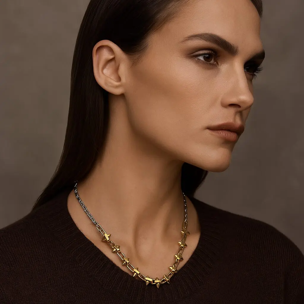 Defiant elegance, redefined. The Vetra blends edge and sophistication through contrast—oxidized sterling silver meets 14k gold-filled spikes, each link a balance of strength and shine. Its sculptural design catches light and intrigue alike, pairing effortlessly with layered chains or standing boldly on its own.